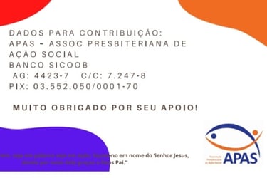 APAS – ASSOCIAÇÃO PRESBITERIANA DE AÇÃO SOCIAL - CNPJ: 03.552.050/0001-70 IE: Isenta -Rua Guilherme de Almeida, 318 – Vila Santana – Leme – SP – CEP: 13.616-420