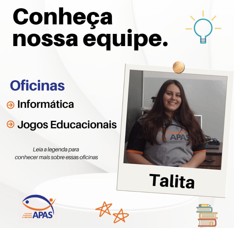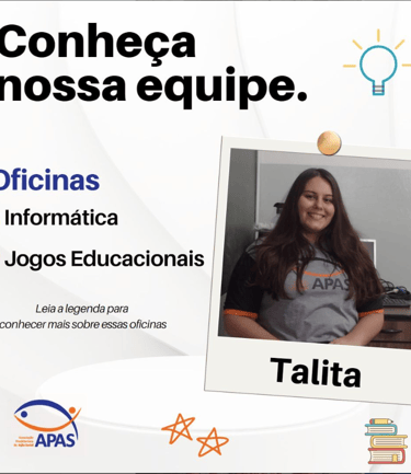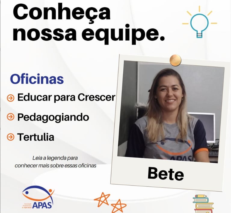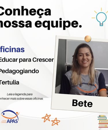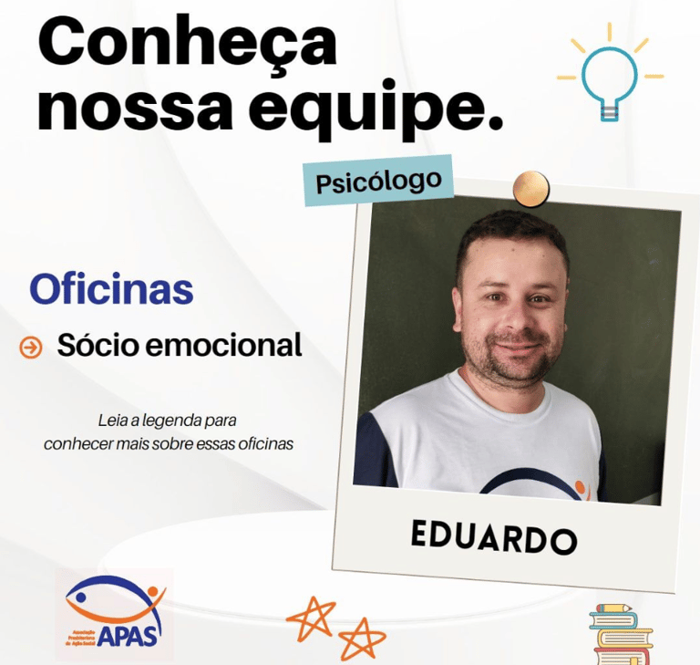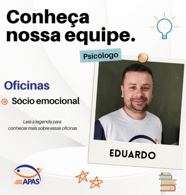 Meu nome é Eduardo (Du) sou psicólogo da APAS e também desenvolvo a Oficina das Emoções com as criança e adolescentes que apresentará ferramentas que ajudarão eles a solucionar seus maiores dilemas e contribuir para o desenvolvimento de competências pessoais (autoestima e resiliência), sociais (relacionamento interpessoal, habilidades de administrar conflitos entre outros, de participar e expressar sentimentos e opiniões) e cognitivas.
